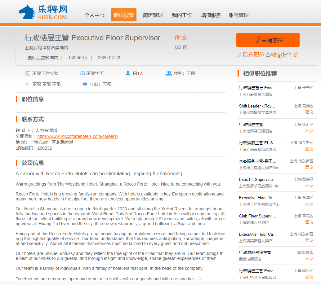 上海罗克福特西岸酒店宴会销售协调员