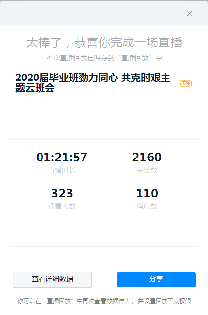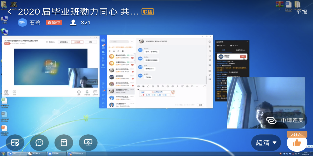 2020年2月28日15:00分思想导师石玲给2020届毕业班所负责的6个班级共320名学生,通过钉钉直播开展了一场为时1小时20分钟的云班会,班会共分为6个板块:1、疫情期间毕业生的心态与状态;2、毕业生毕业与就业工作实施方案;3、加强疫情防控的工作举措和具体要求;4、特殊时期你务必遵守的要求;5、互动时刻;6、感谢时刻。这场云班会首先分享给大家,思想导师与毕业生们之间一通通电话、一条条短信传递着最温暖、最真切的爱与关怀,无论学生身处何地,思想导师的心都与毕业生在一起,学生们的一声“平安”是这个冬天里最让人踏实的话语,所以同学们务必要坚持做好每日一报制度;同时石玲老师重点从毕业生角度解答毕业生所关心的问题、强调毕业生关注的网络招聘会、春季网络招聘会,积极参加线上招聘不错失任何就业机会;并将近期日报工作与健康反馈工作进行通报,强调疫情防控期间,作为大学生哪些我们应该做?应该怎么做?要求全体毕业生严格遵守学校文件规定,要顾全大局,不可擅自而为之。同时,也将我们近期所统计的数据进行通报,从思想上让每位毕业生深刻重视,班会最后也增加了互动与感谢环节,重点表扬了5名参加防疫工作志愿服务的学生,使得总体气氛活跃,给大家带来一丝轻松感。