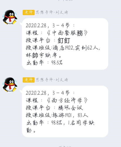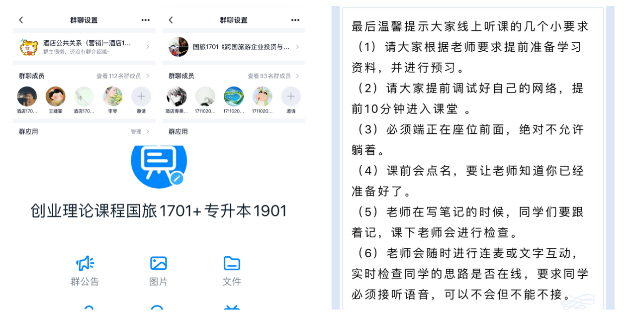 为保证线上教学正常进行,在正式开学“第一课”之前,我院思想导师根据课表督促班委组建“一班一课一群”,全体思想导师加入管理学生课程群,保证所有学生在课程群,提前将线上教学注意事项以及要求告知学生。