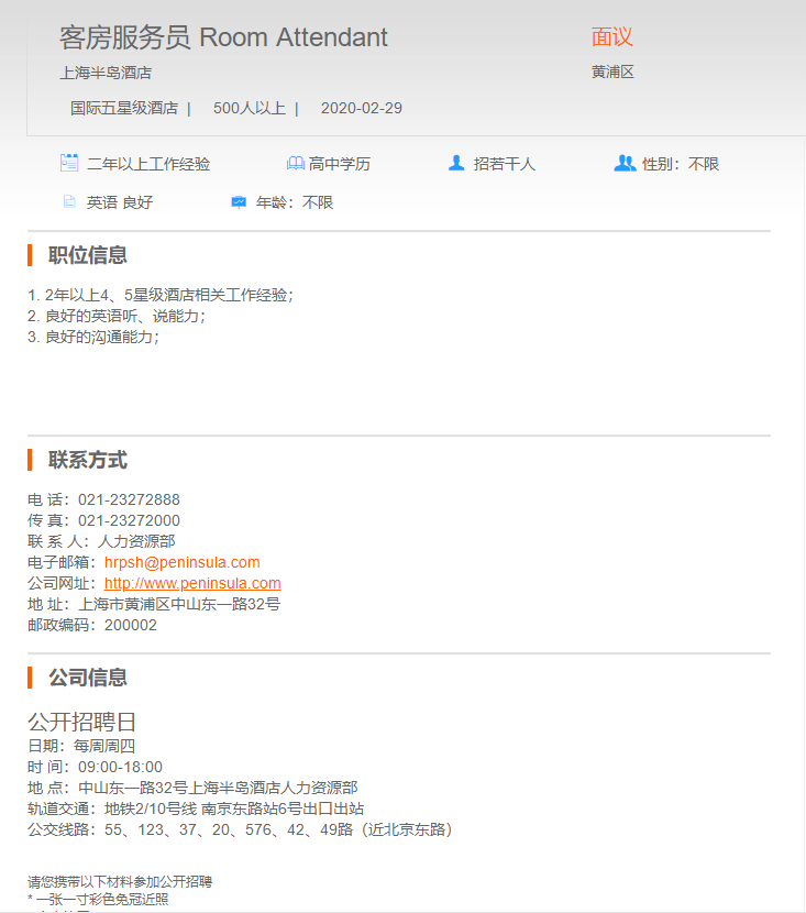 上海半岛酒店客房服务员