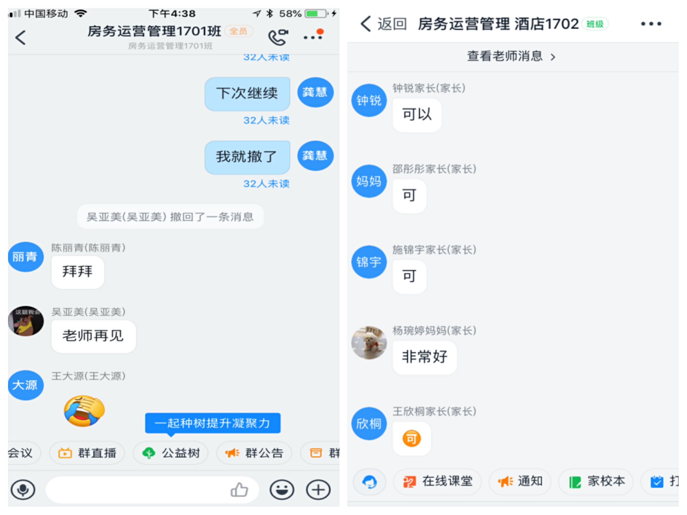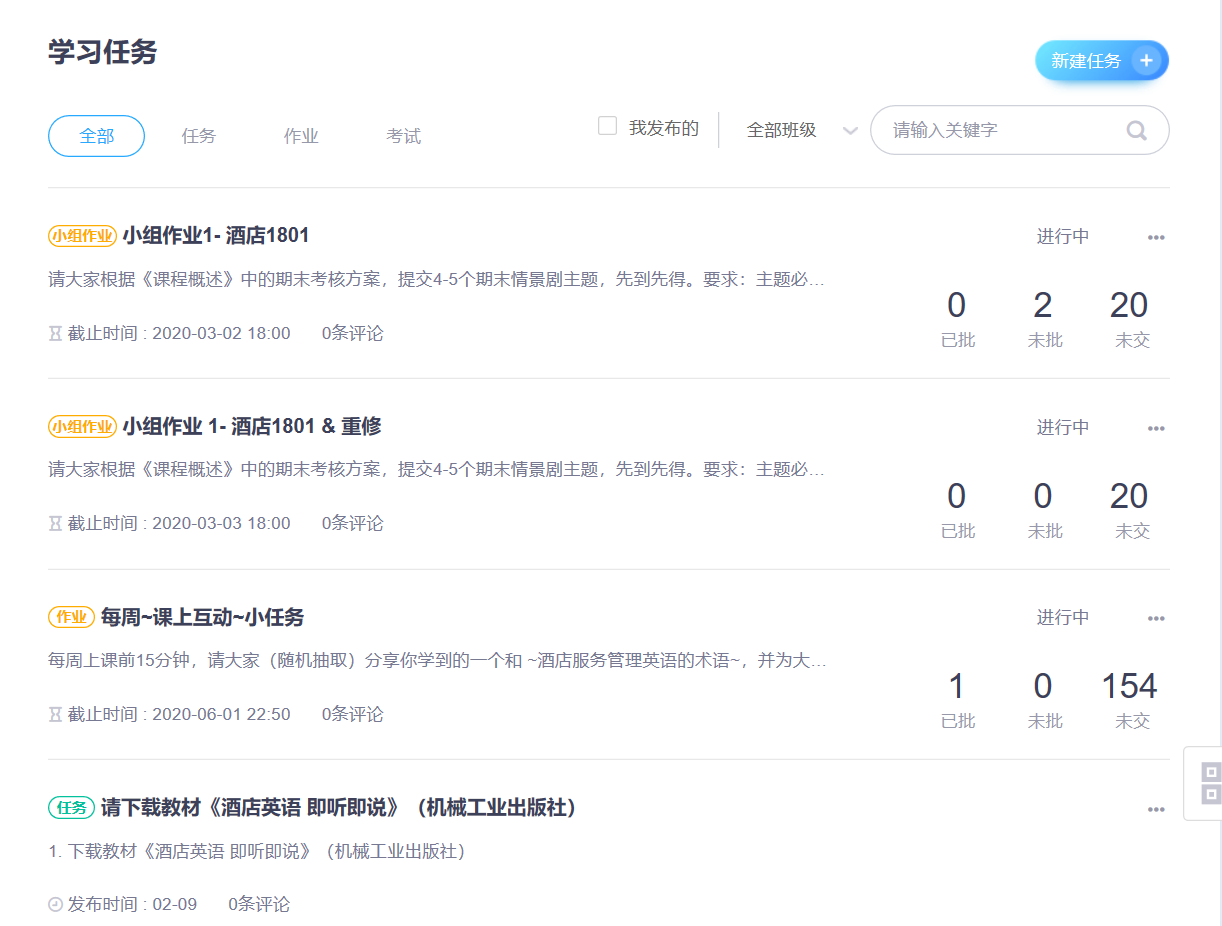 疫情期间,为了积极响应学校“停课不停学”,我院酒店管理专业教师积极采取新技术在网络教学中的应用并认真准备所有课程。耿佳老师基于前期使用智慧树教学平台的经验,再次将自己的《酒店英语》和《宴会设计与会议统筹》课程与智慧树网络课程加以紧密结合,并开通了共享课程,让同学们获得丰富的学习资源。同时,借助智慧树的功能为学生发布学习任务。为保障每次开课的顺利进行,在前期对授课班级进行课程直播的测试基础上不断改进,教学效果良好。