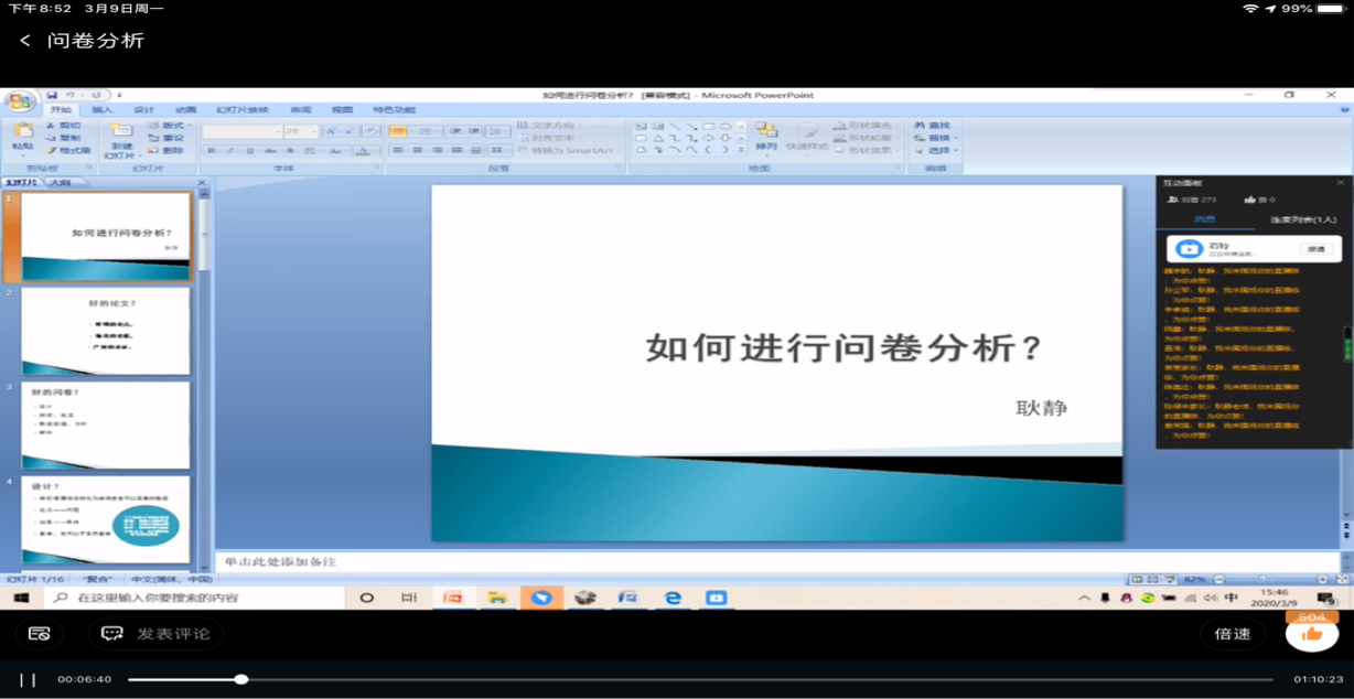 毕业论文设计是检验一个大学生四年学习效果的一项重要成果,随着毕业季的到来,我院2020届毕业生的毕业论文指导工作在有序开展中。在前期论文完成情况调查基础上,根据指导老师以及学生的反馈,为帮助大四学生们更有效地解决目前的问题,我院耿静教授为全体大四学子开展关于毕业论文问卷调查数据整理与分析的专题讲座。