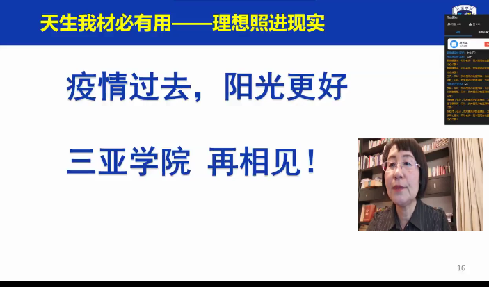 作为2020届即将毕业且面临着人生重要选择的大学生,自然是一个比较焦虑的群体。学院为我们全体毕业生开展了关于职业规划、就业选择、就业指导、论文讲解等的线上直播,学院的思想导师、老师、各级领导轮番上阵,用自己多年的经历和独特的见解,从个人心态、就业选择、旅游相关行业的发展、如何提升自己的就业竞争力等的不同角度的为毕业生答疑解惑,让本是焦虑的我们平复了心态,开始了精神上的思考与行动。我们相信在学院的帮助下,即将毕业的我们可以努力克服难关、乐观积极的向着美好的未来前进。
