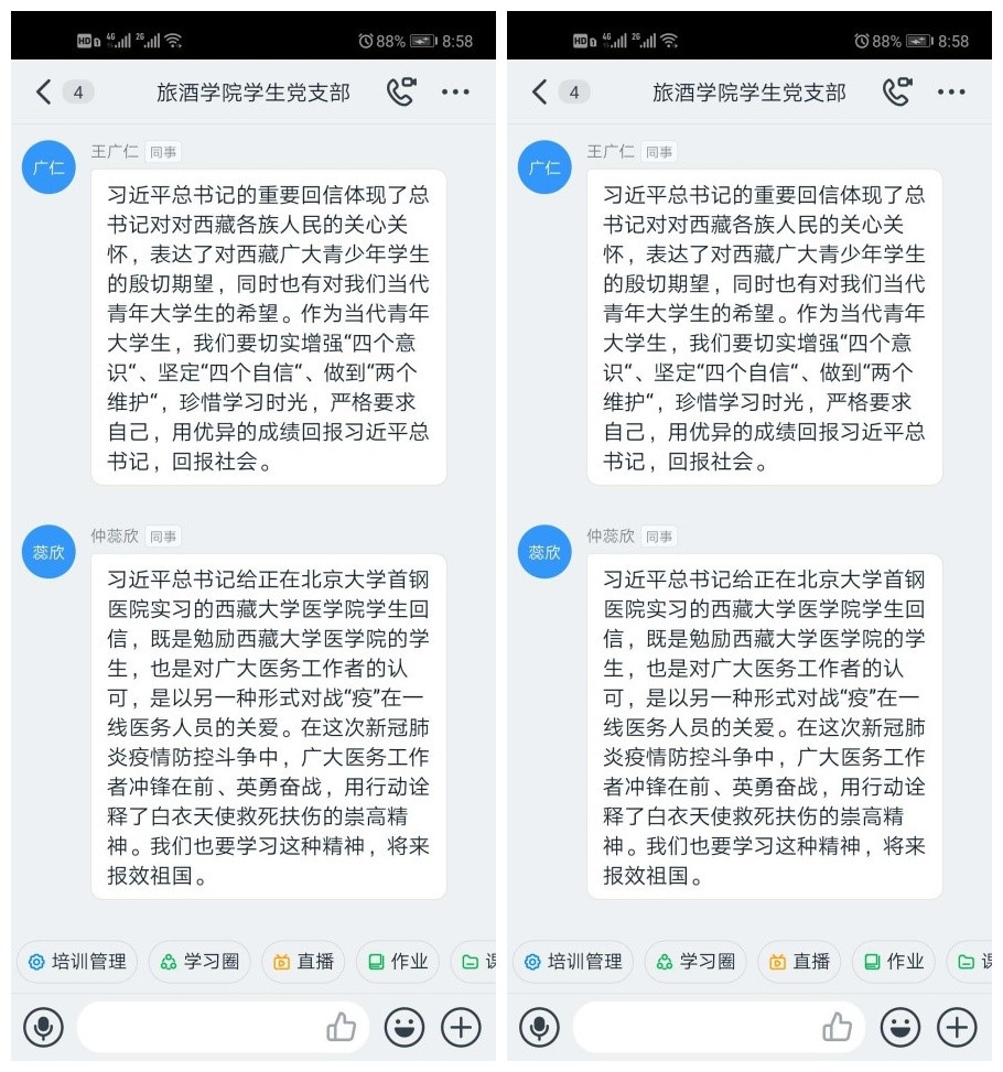 学习文件一经发送,便引起旅酒学院学生党支部的党员和入党积极分子的热烈讨论。他们表示:习近平总书记的话语不仅是对在北京大学首钢医院实习的西藏大学医学院学生的鼓舞,也是对全中国所有大学生的鼓励,这激励着每一位大学生好好学习本领、提升专业学术水平、遵循国家政策,用国家政策促进自我发展,以自我发展推动国家的发展,要认真学习贯彻习近平总书记回信精神,努力奉献自我,实现个人价值最大化。