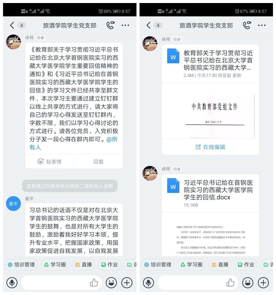 旅酒学院学生党支部于2020年3月16日响应国家教育部的号召———停课不停学,组织旅酒学院学生党员及入党积极分子开展了线上学习《教育部关于学习贯彻习近平总书记给在北京大学首钢医院实习的西藏大学医学院学生重要回信精神的通知》和《习近平总书记给在首钢医院实习的西藏大学医学院学生的回信》活动。