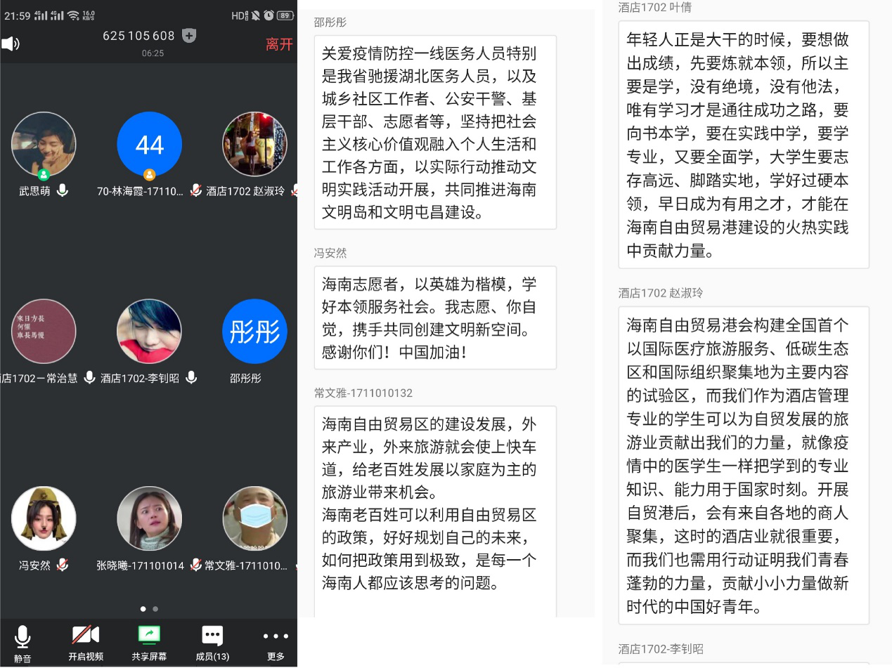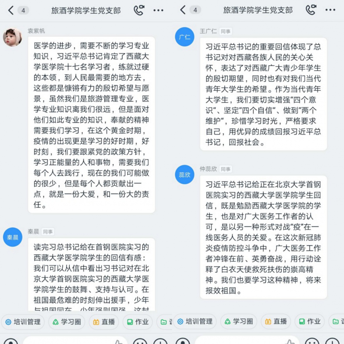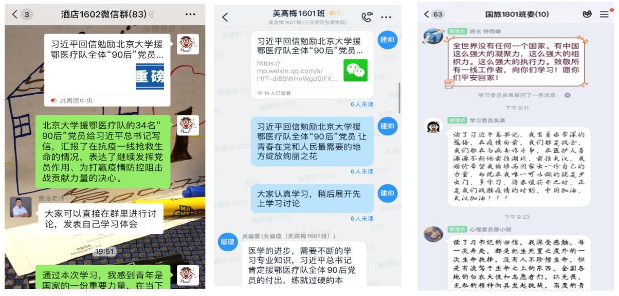在旅酒学院党总支的宣传组织下,我院全体思想导师和学生党支部全体成员积极组织开展了各种形式的线上学习活动,集体认真学习回信精神,并结合海南自由贸易港建设做贡献展开讨论与思考,我院学生积极分享学习与思考心得,立下青春誓言!