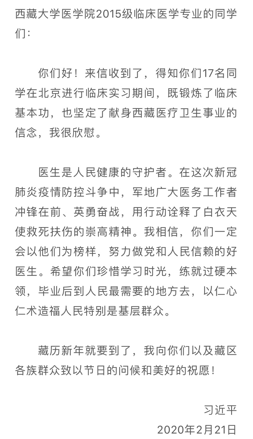 习近平总书记给在首钢医院实习的西藏大学医学院学生的回信全文
