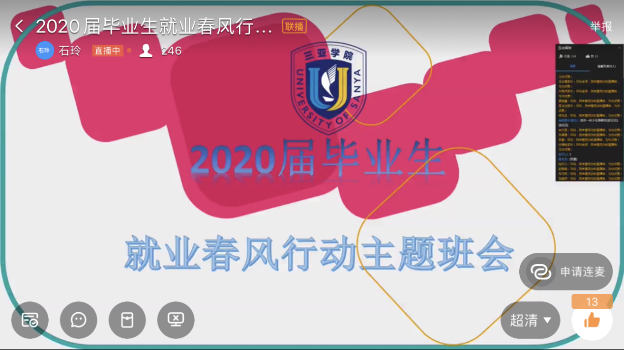 3月20日11时我院毕业班思想导师石玲与她所负责的2020届毕业生们,通过云课堂的方式召开了就业春风行动主题班会。石玲老师通过线上平台钉钉直播开展了一场为时1小时的云班会,班会共分为4个板块:1、严明纪律,不擅自流动;2、你的就业采取了多少行动?3、近期通知请及时关注;4、学习给全体“90”党员回信。