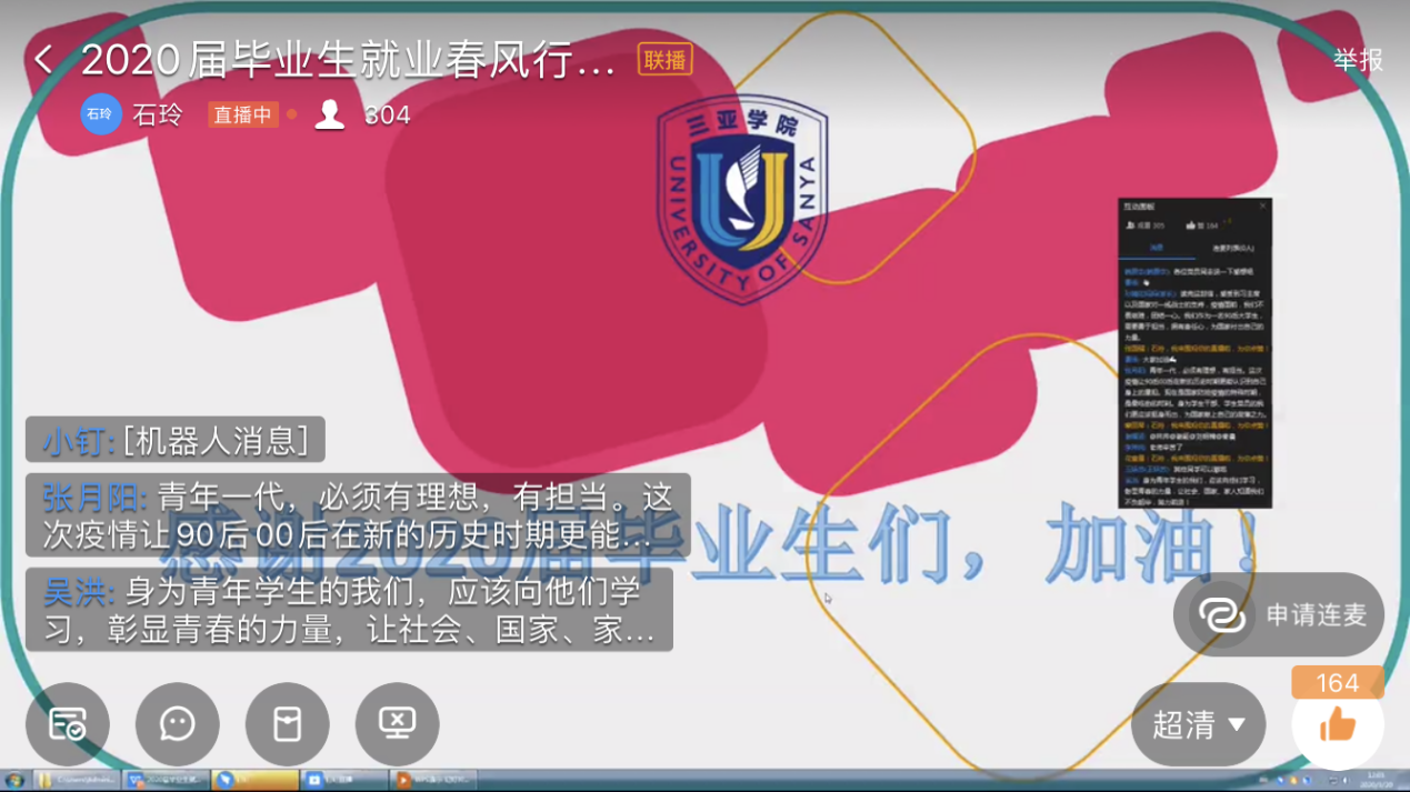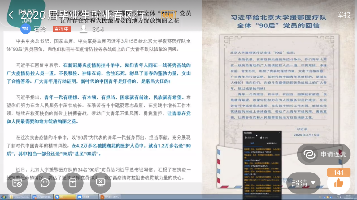 3月20日11时我院毕业班思想导师石玲与她所负责的2020届毕业生们,通过云课堂的方式召开了就业春风行动主题班会。石玲老师通过线上平台钉钉直播开展了一场为时1小时的云班会,班会共分为4个板块:1、严明纪律,不擅自流动;2、你的就业采取了多少行动?3、近期通知请及时关注;4、学习给全体“90”党员回信。