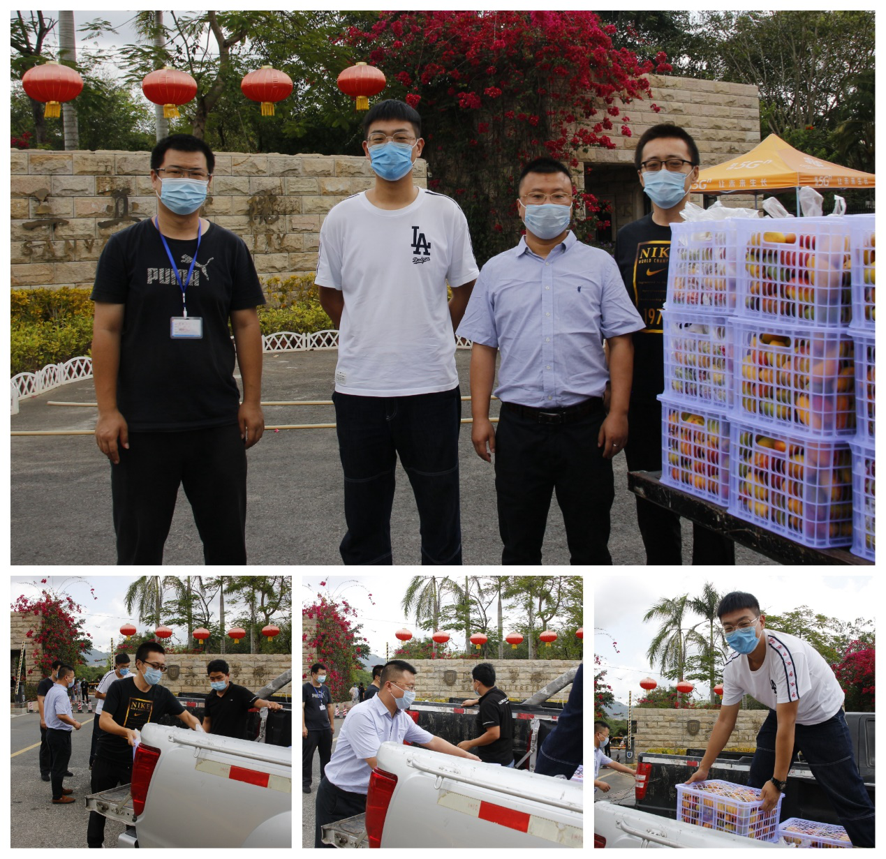 我院党总支副书记王翔老师,社区管理中心李政主任,校团委、学生处马炳琛老师与张国强同学一起搬运芒果