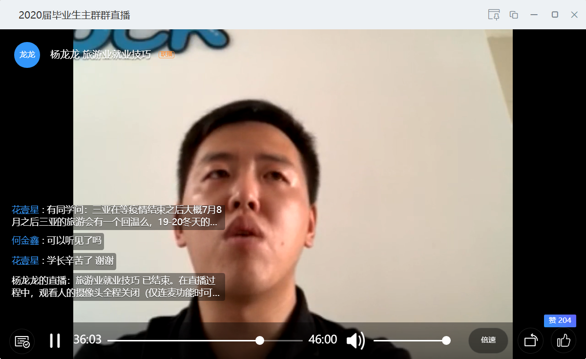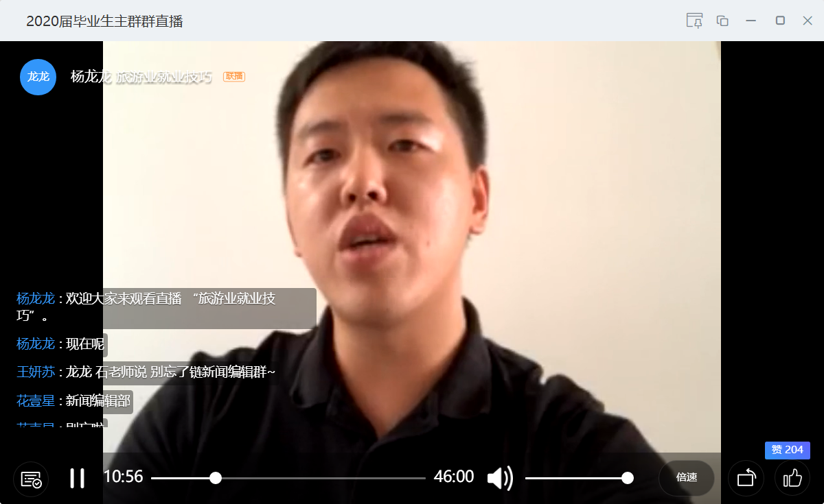 随着疫情的稳定发展,我院2020级毕业生们离踏上求职之路的旅程已不再遥远。为助力毕业生在未来求职道路上的顺利发展,我院邀请了历届优秀校友来为学弟学妹们分享经验。2020年3月25日下午4时举办“旅游业就业技巧”为主题的线上讲座,邀请的是我院会展专业08级校友何金鑫,现创建了三亚洛克旅拍工作室,我院16级学生积极参加线上分享会。