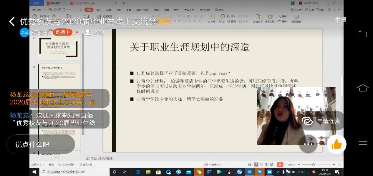 3月26日下午3时,我院邀请到13级优秀校友尤梦怡与应届生进行线上交流会,此次交流会以专业细分、职业生涯规划的贯通性为主题,并结合当下市场形式和国家政策,我院应届毕业生收获颇丰。