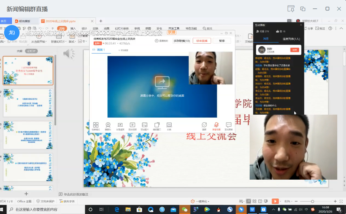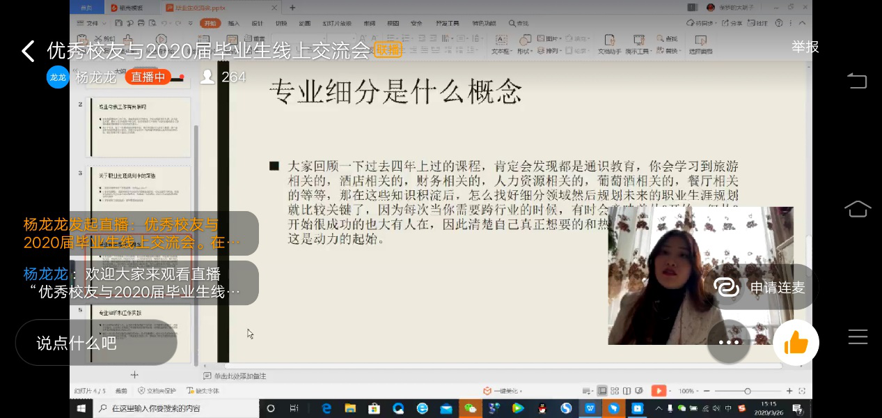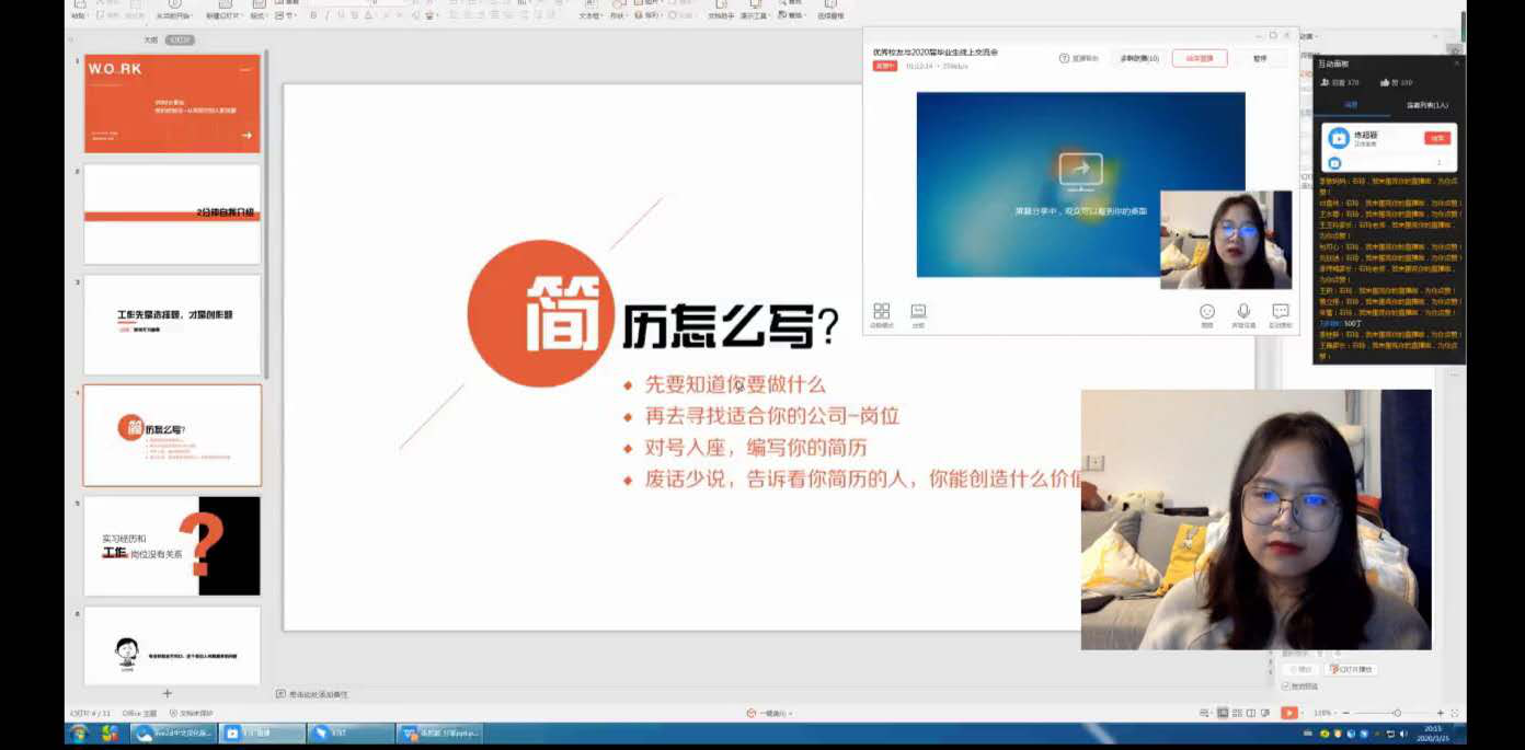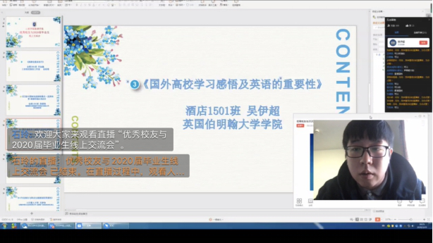 在此次线上交流分享会中,校友们就自身经验为毕业生们答疑解惑,不仅展示了我院校友的多姿风采,更是为毕业生指明未来道路方向,希望2020届毕业生们青出于蓝而胜于蓝,不断精进自身,走上各自的工作岗位,诠释9159金沙游戏场走进校园是为了更好地走向社会的育人理念。