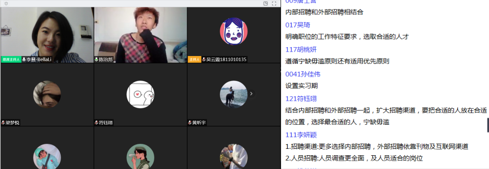 ②增加直播互动。直播互动包括三种形式,第一种形式为验证性互动,目的是为了检测学生是否在线,一般以是否类问题、选择性问题为主,要求学生在一个短的时间范围内全员答题;第二种形式为讨论区文字互动,目的是让更多的学生参与到思考中。一般以案例、时事现象评论、简答题为主。覆盖面基本可以达到全部学生的50%。第三种形式为视频互动,目的是避免学生溜号,教师随机点名答题。一般与讨论区文字互动相配合,个别同学视频答题的同时,其他同学在讨论区答题。覆盖面约在一节课可以达到5-6名同学。