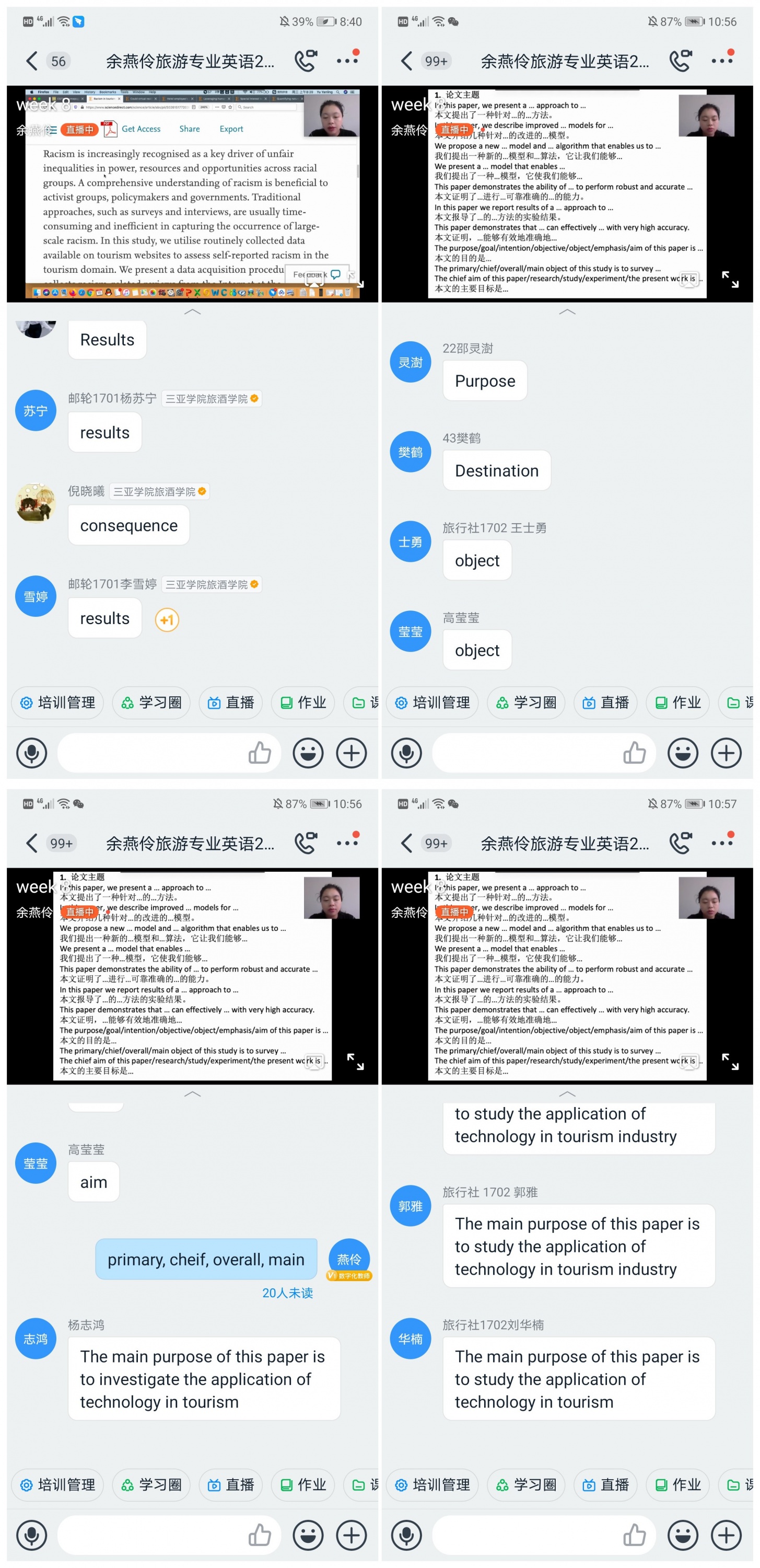 从接到线上授课的任务开始,余燕伶老师就已经开始思考如何在有限的线上授课时间里,既完成授课目的,又积极调动课堂气氛,提高同学们的参与度,实现同学们自主学习能力的提升,达到较好的自主学习效果。结合线上教学的特点,余燕伶老师选择了钉钉作为主要教学平台,通过钉钉可以保存教学直播录像,方便由于网络不畅不能及时加入课堂的同学进行回看,同时同学们还可以通过钉钉界面即时进行会话,完成课程中英文翻译的任务。