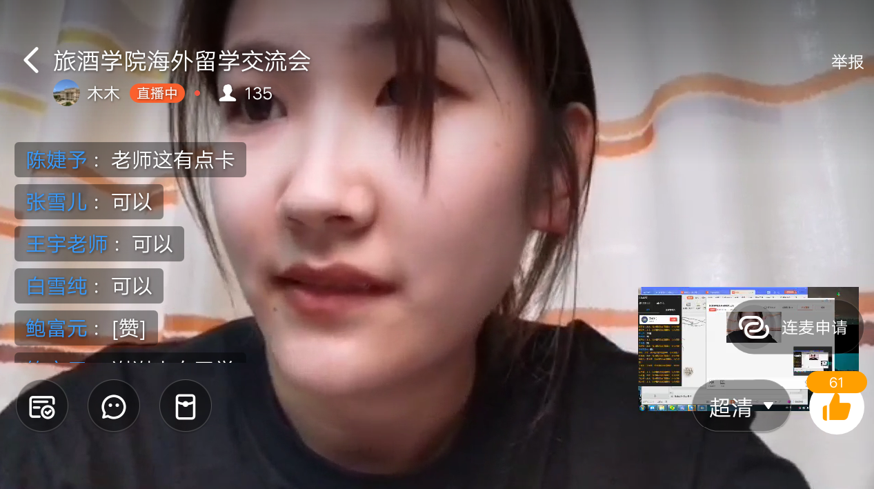 随着国内留学热潮的高涨,为让更多的应届毕业生与甚至在校学生尽早对自己的学习生涯做出正确的规划和选择,我院于4月22日下午特邀四位获得国外留学offer的酒店毕业生通过云分享介绍有关出国申请流程及其注意事项,酒店管理专业负责人鲍富元、学业导师王水卿以及部分学生参加分享会。