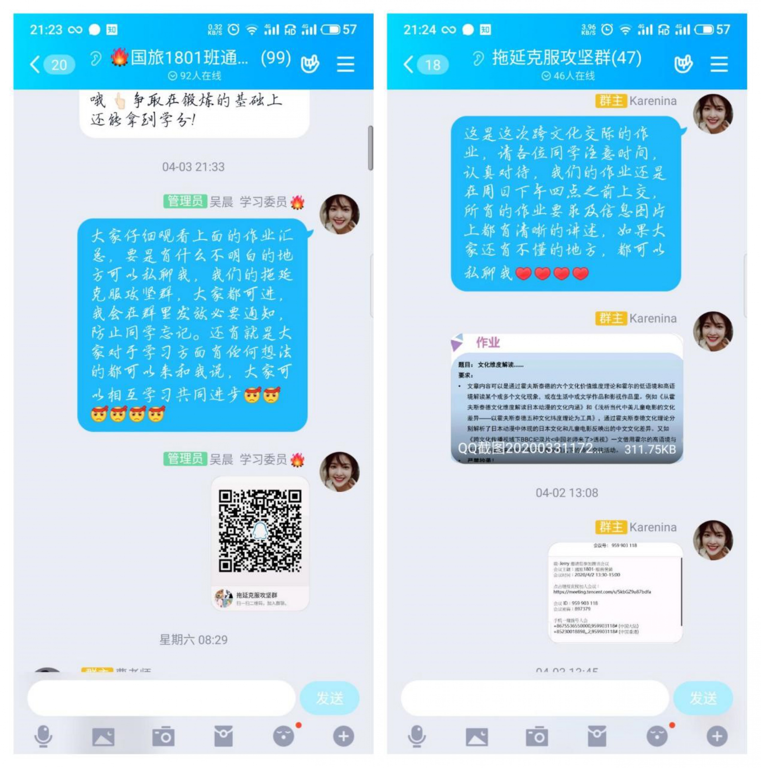 国旅1801班是一个充满集体荣誉感、团结友爱的班级。疫情期间,同学们积极配合学校开展的打卡活动,朋友圈中也因此诞生了各种形式的打卡大神。虽然我们身处各地,但是也能通过这样的形式将我们的心连在一起,在学习与健康之中全面发展。随之到来的网课阶段,同学们由最初的不适应转为接受。“好记性不如烂笔头”,网上授课有回看视频的功能,因此同学们的笔记也逐渐变得丰富起来。