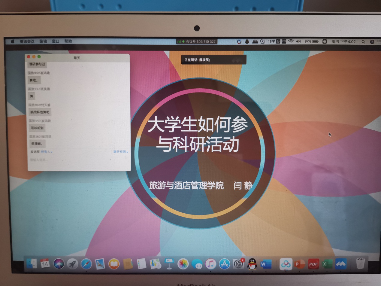 2020年5月14日下午四点到五点半,旅游与酒店管理学院旅游管理(国际旅游管理)专业的闫静老师开展了主题为《大学生如何参与科研活动》的科研讲座。讲座以在线形式,通过腾讯会议开展。