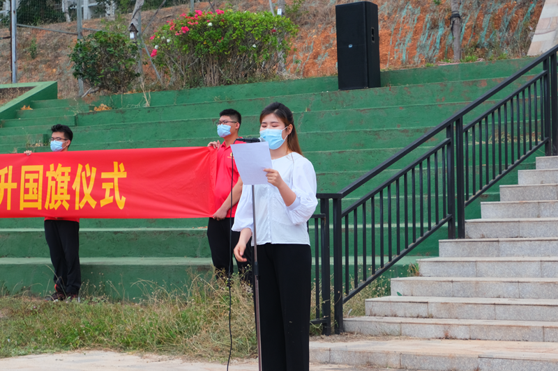 迎着朝阳,国歌响起、国旗冉冉升起,国旗之下的师生注视着国旗,心里充满着对祖国的热情和对抗疫工作的敬意。升旗仪式后,由传媒学院16级优秀毕业生代表沈秋月发言,语言中带着对即将离校的不舍与感恩,同时歌颂着抗击疫情的战士,呼吁在场学生向其学习奉献和顽强拼搏的精神,风华正茂,少年多奇心;志心无悔,青年终长成。