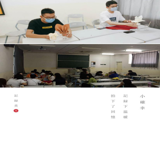 经过了一周的调整适应,5月25日午10时10分,我们班迎来了本学期第一节线下课——杨樨老师的《餐饮经营管理》。按照正常进度,这门课程已经准备进入实训考核阶段,要求每位同学掌握口布折花的十种方法,并录制完整视频上交。