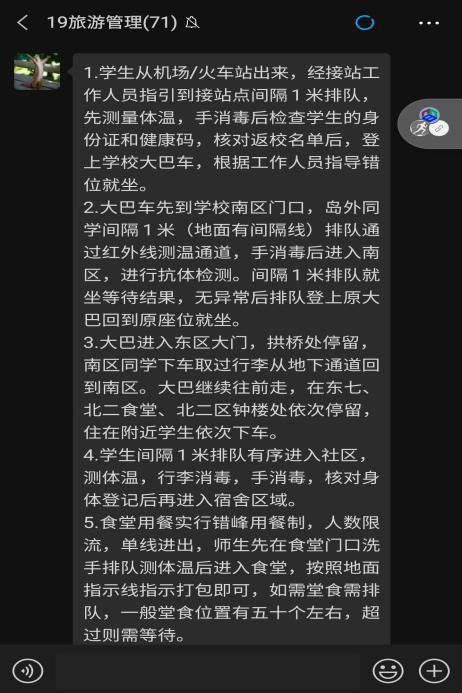 在返校的这段时间,从准备阶段开始一直到完成返校,专升本1901班的导员和班委们一点都没敢放松。准备阶段时班委每天督促体温打卡,到返校小贴士及时放送。导员每天在群里询问同学目前的生活区状况,以及到开学前放送的到校贴士。