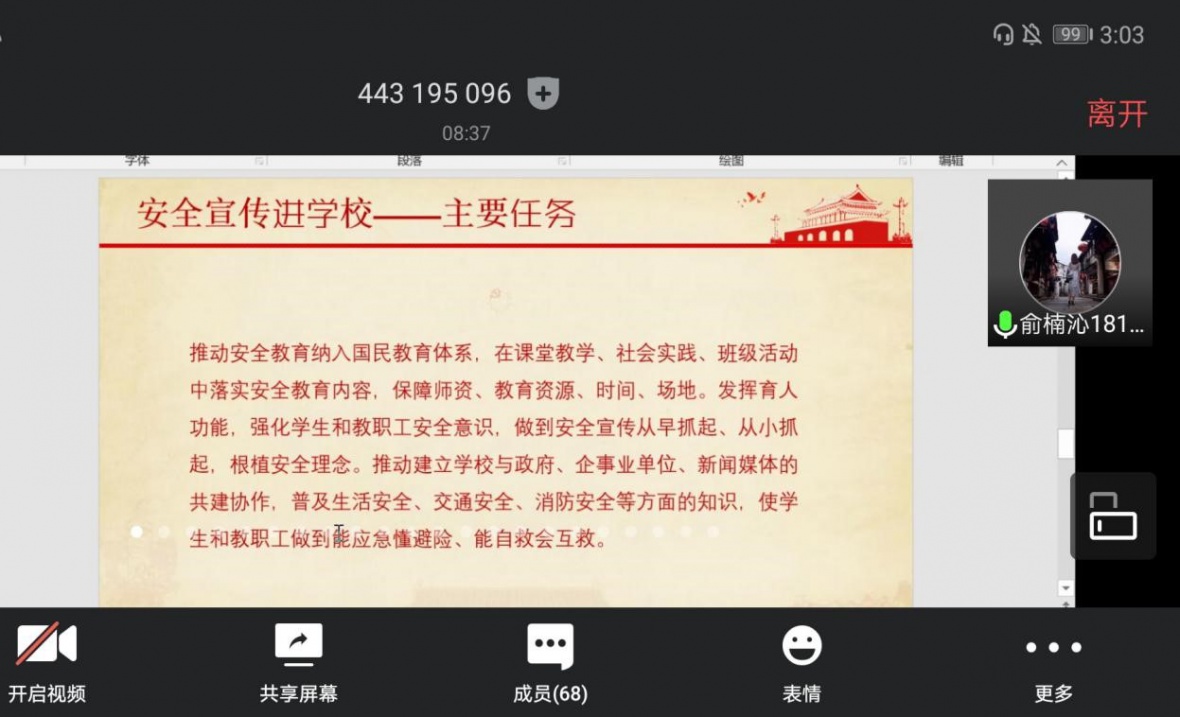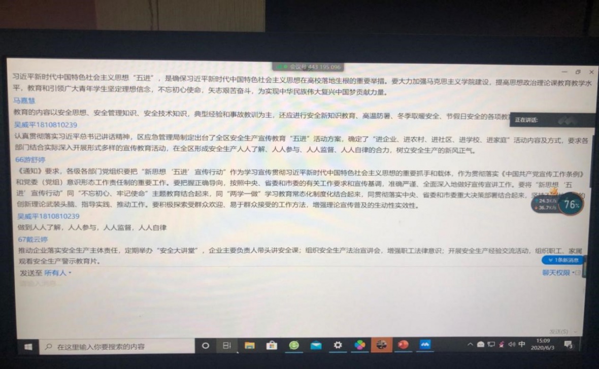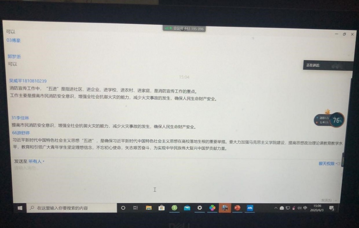 6月3日下午三时,旅行社1802班在腾讯会议开展关于“五进”安全教育的主题班会。班会由本班团支书俞楠沁主持,在全班同学的积极配合下,班会顺利进行。