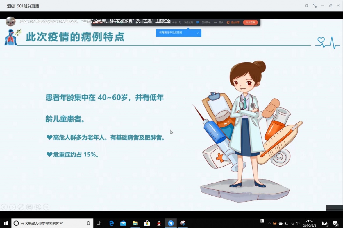 班会伊始,酒店1901团支书殷铭铭先对本次班会主要内容向同学们进行了简单地介绍。班会第一项,是关于我们生命安全教育的,近期疫情虽然已经有所好转,但我们还是要保持警惕,团支书结合ppt讲解了冠状病毒的概念,感染患者的临床表现,此次疫情病例的特点和如何预防新型冠状病毒感染等。班会第二项,关于近期学校由于疫情封校,有些学生违反校规外出、点外卖等问题。希望同学们能遵守学校校规,保障自身及他人的生命安全。班会第三项,是关于保障个人财产安全问题,我们应该抵制网贷,合理分配自己的生活费,保持正确的消费观。班会第四项是关于推进安全宣传“五进”工作方案,具体是指为扎实推进安全宣传进企业、进农村、进社区、进学校、进家庭,牢固树立安全发展理念,大力加强公众安全教育,进一步提高全社会整体安全水平所制定的方案。本班同学一起阅读了关于“五进”的文件。