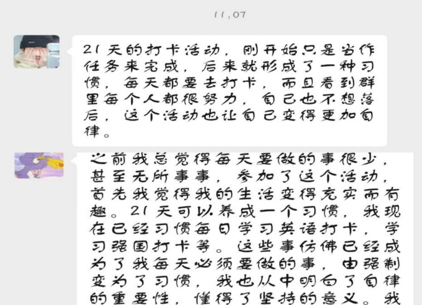 21天在行为心理学中亦被称为“21天效应”,一个人的动作或想法,如果重复21天就会变成一个习惯性的动作或想法。良好习惯的养成往往源于坚持不放弃,希望本次历时21天的学习活动能让参与者在活动结束后依旧保持这份坚持的品质和良好的学习习惯。相信在学院的良苦用心下,我院也必会涌现出更多品学兼优的学生。
