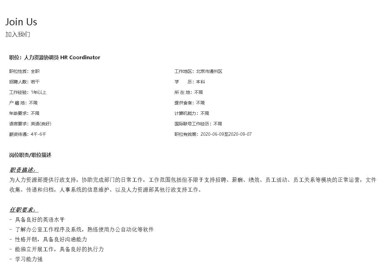 北京环球度假区人力资源协调员