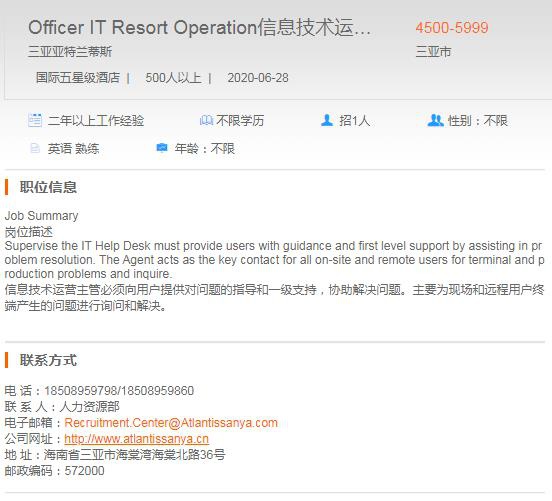 三亚亚特兰蒂斯信息技术运营主管