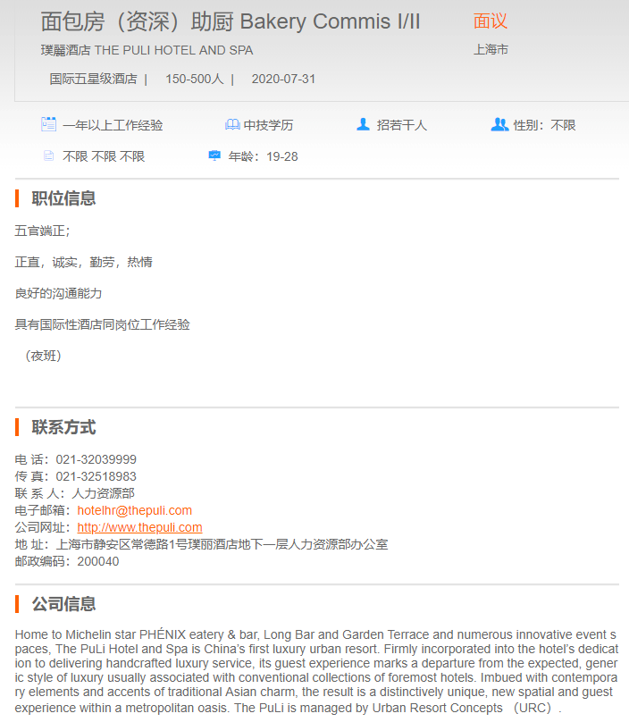 璞麗酒店面包房资深助厨
