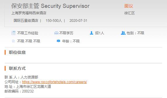 上海罗克福特西岸酒店保安部主管