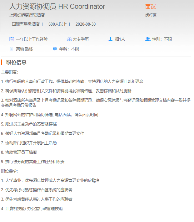 上海虹桥康得斯酒店人力资源协调员
