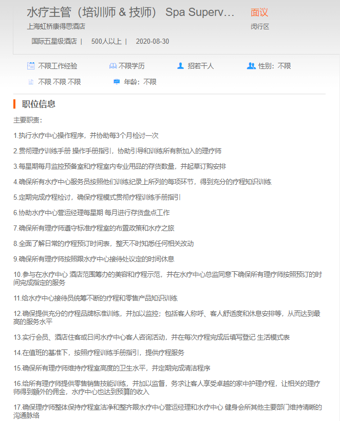 上海虹桥康得斯酒店水疗主管