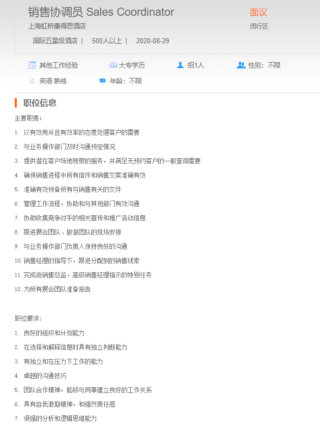 上海虹桥康得斯酒店销售协调员