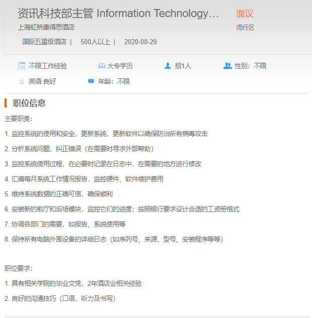 上海虹桥康得斯酒店资讯科技部主管