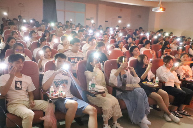 今夜灯光熠熠。同学们自发为好节目打开闪光灯,这说明了同学们对节目的认可、对此次晚会的认可。今夜期望2020级会展新生能在晚会中有所成长,加强爱国主义教育,今后成为一个海南自贸港建设的扛旗人。
