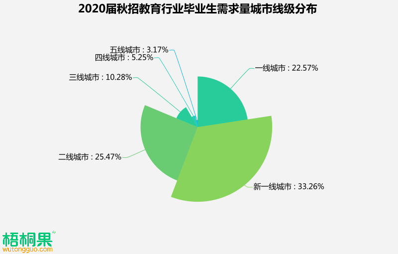 上图为梧桐果统计的2020届秋季校园招聘各城市线级教育行业对于毕业生的需求量。如上图数据所示,当前新一线城市教育行业对于毕业生需求量最大,占比为33.26%;二线城市教育行业对于毕业生的需求已经不输一线城市,占比为25.47%;一线城市需求量位列第三,需求量占比为22.57%;三四五线城市需求量相对较少,仅为10.28%、5.25%和3.17%。