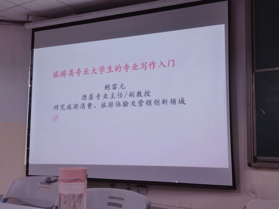 为帮助学院旅游类专业的全体新生了解专业写作,提高专业写作能力,适应大学专业课程学习和未来职业要求。我院酒店管理专业鲍富元老师10月21日在南区书知楼1208教室,围绕旅游类专业写作的常见类型和规范要求,为80多名同学组织了精彩的学术讲座。