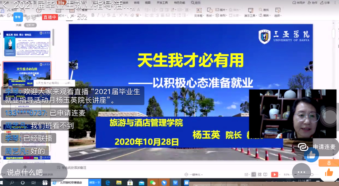 梦想不会发光,发光的是追梦的你,一往无前去追梦,青春方能无悔。为让我院2021届毕业生以积极的心态准备就业,我院于10月28日下午3时在线上开展“天生我才必有用——以积极心态准备就业”主题讲座,我院院长杨玉英、团委副书记李琴出席本次讲座,2021届毕业生积极参加此次讲座。