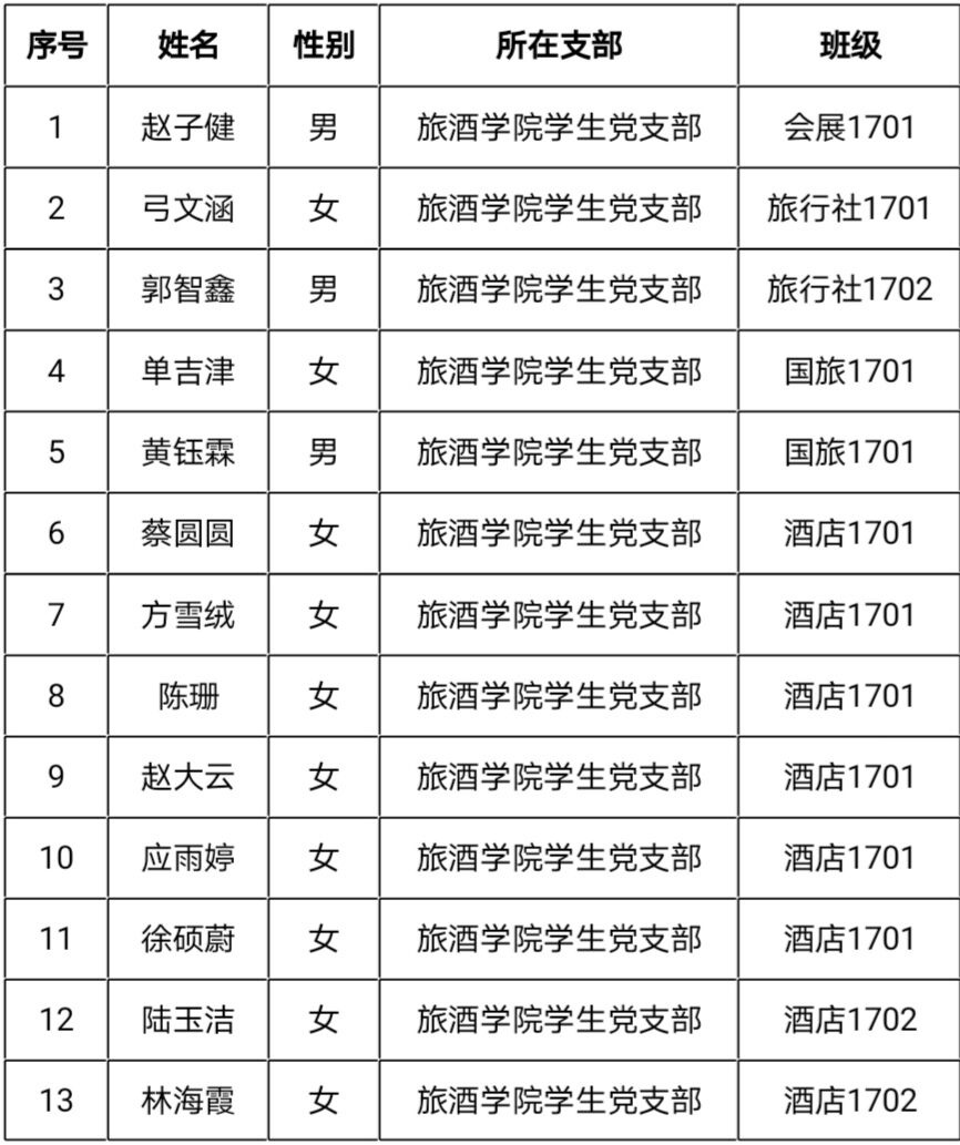 经党组织一年来的培养教育和考察,预备党员赵子健等十三名同志预备期满,拟在近期召开党员大会分别讨论赵子健等十三名同志的转正问题。为了进一步增强发展党员工作的透明度,严格组织发展工作程序,防止不正之风,确保发展新党员的质量,现将预备期满的预备党员名单公示如下: