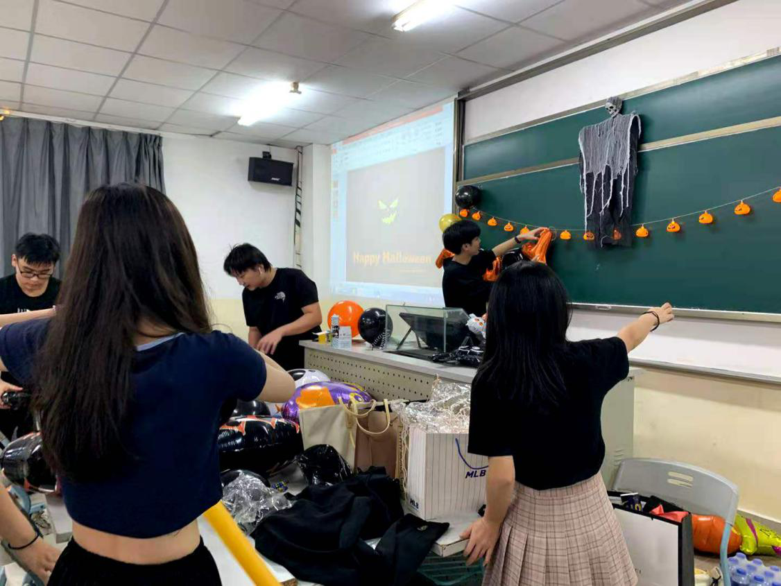 30日下午,班委们来到预定好的2105教室开始场地的布置,历时两小时,下午六时,一切准备就绪。学生们纷纷化好了万圣节主题类的妆容,如约来赴。本次班会共分为五个环节,不同环节为不同的游戏项目。在班委们的带领下,学生们随着游戏环节的递进渐渐融入了这欢快的氛围,积极参加着各种游戏,好不热闹。晚上八时,班会在学生们多姿多彩的配音表演中拉下帷幕。