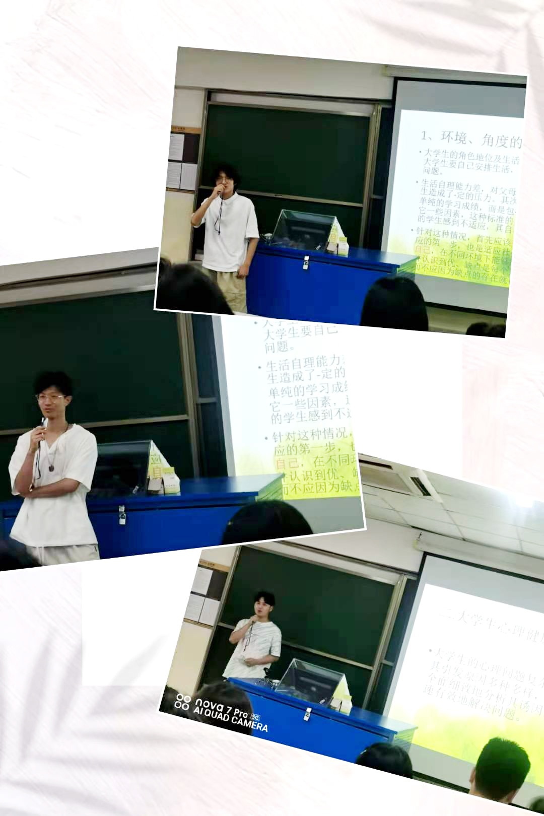 班会主要分为两个板块:团队心理建设和心理健康教育。第一板块主要讲述团队心理建设的重要性,教给同学们一套手指放松解压操,随后向同学介绍团队心理建设的几种经典游戏。第二板块重点讲了大学生心理健康问题原因分析:环境、角度的变化引发心理冲突,学习压力造成的焦虑心理,人际关系不良导致情绪及人格障碍。为了更好地让同学们体会到心理健康的重要性,班会还准备了游戏和宣传短片供同学们放松心情。