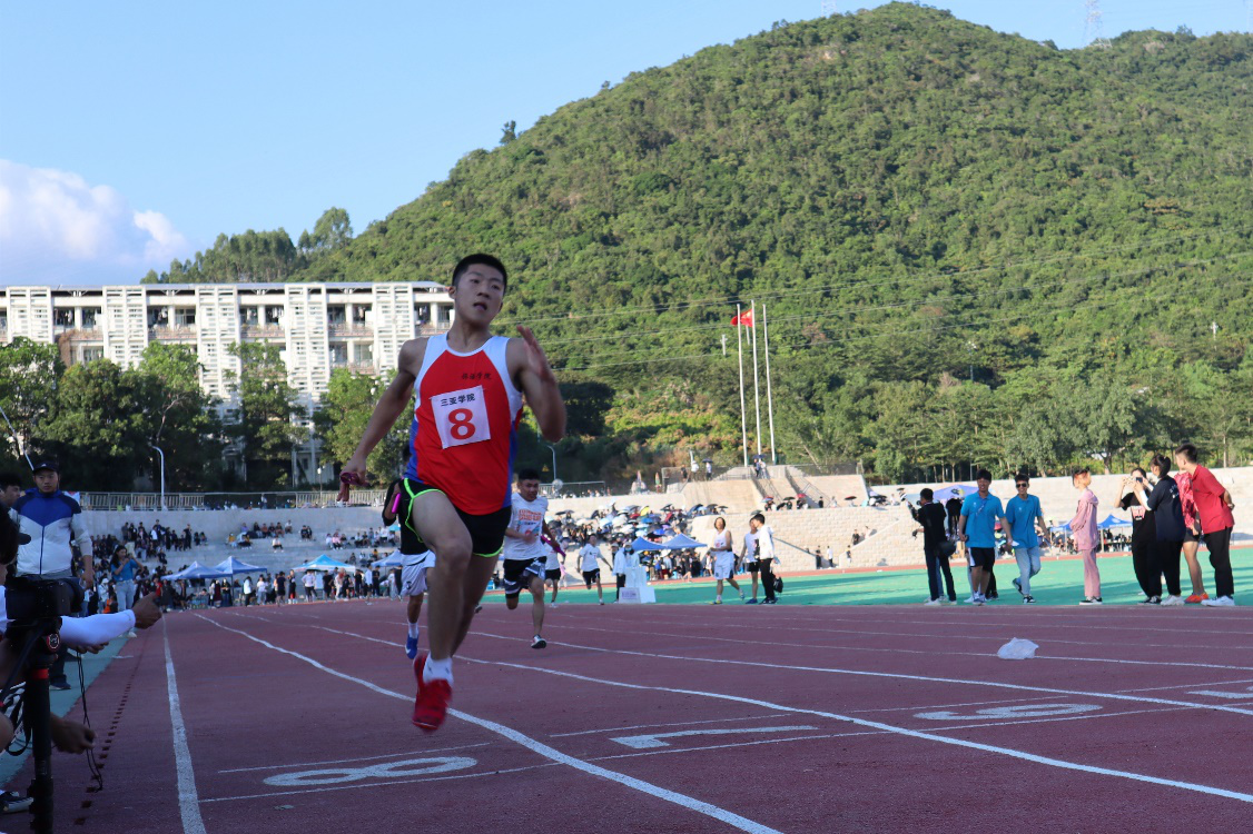 我院男子组参赛选手手拿接力棒在赛道上奔跑