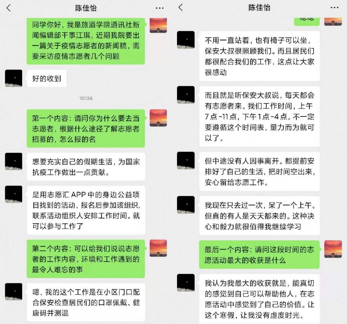 “想要充实自己的假期生活,为国家抗疫工作做出一点贡献。”这是旅游2002班学生陈佳怡报名参加志愿者活动的目的。学生陈佳怡在家通过手机软件“志愿汇”报名参加了志愿组织。她在采访中谈到了这段时间她参加志愿工作的具体内容:“我的工作是在小区门口配合保安检查居民们的口罩佩戴、健康码并测温。居民们都很配合我们的工作,每天都会有志愿者来,志愿者们会提前安排好自己的生活,把参加志愿活动的时间空出来,全心投入志愿工作。有人是天天都来的,这种决心和毅力就很值得我继续学习。”在采访最后,她谈到了“参加志愿活动能真切的感觉到自己可以帮助他人,感觉到自己的价值,防疫志愿工作,让我没有虚度时光。”