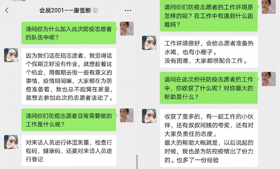 没有从天而降的英雄, 只有挺身而出的凡人。我院会展2001班的唐雪娜本着提升自我和为疫情防控出一份力的初心,主动报名了大学生疫情防控志愿活动,为疫情防控战助力。唐雪娜见证了2020年疫情初期防疫志愿者们的辛苦工作,在全民共同抗疫的2021年,她也毫不犹豫地加入了大学生防控志愿者的队伍,希望为自己的假期增添不一样的色彩,让其变得更有意义。对于担任此次防控志愿者,唐雪娜谈到:“在今年的疫情防控工作中大家都很配合,没有发生争执或者不满的情况。虽然是大冬天在户外工作,但是相关工作人员为志愿者们提供了良好的工作环境——提供了志愿者们休息的小棚子,还准备了充足的热水。这段时间最大的收获是拥有了与工作伙伴间的友谊、叔叔阿姨的夸奖,丰富了实践经验。”