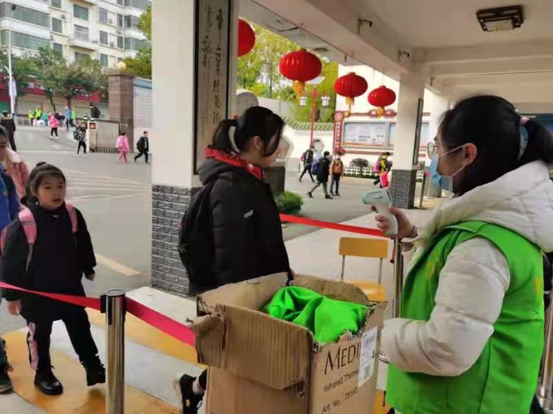 学生志愿者戴紫嫣进行测量体温的志愿工作