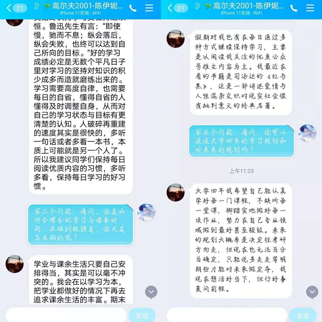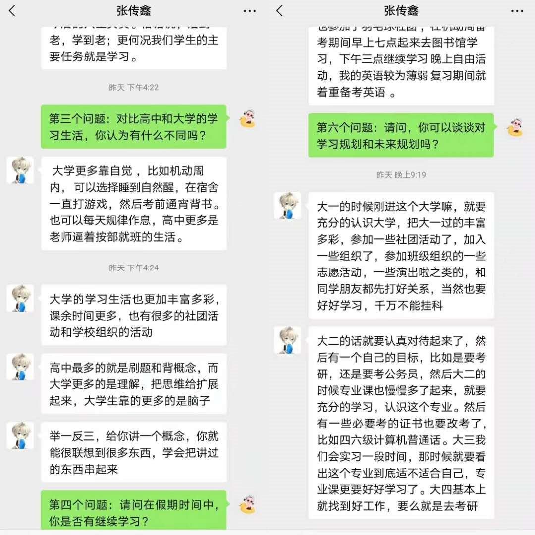 山水一程,笔墨为舟。会展经济与管理专业2001班的张传鑫表示取得第一的好成绩,不仅依赖于自身的坚持与努力,还应该感谢老师们的言传身教。高中与大学学习的不同之处在于大学的生活不仅拓展了我们的思维方式,还丰富了我们的精神世界,这是高中生活所不能给予的。他认为,我们要坚持习近平总书记提出的终身学习观念,从小层面上来说,是为了自身的美好幸福;在大局上,是为了中国社会的美好幸福。在采访中,张传鑫为我们介绍了他在大学四年的学习之旅中的基本规划,在大一时光中要打好坚实的专业基础,提高交际、合作能力,在大二时考取证书证明自己的知识技能;在大三大四的时间里,他志愿考取研究生,去探索更多有关知识的精彩。