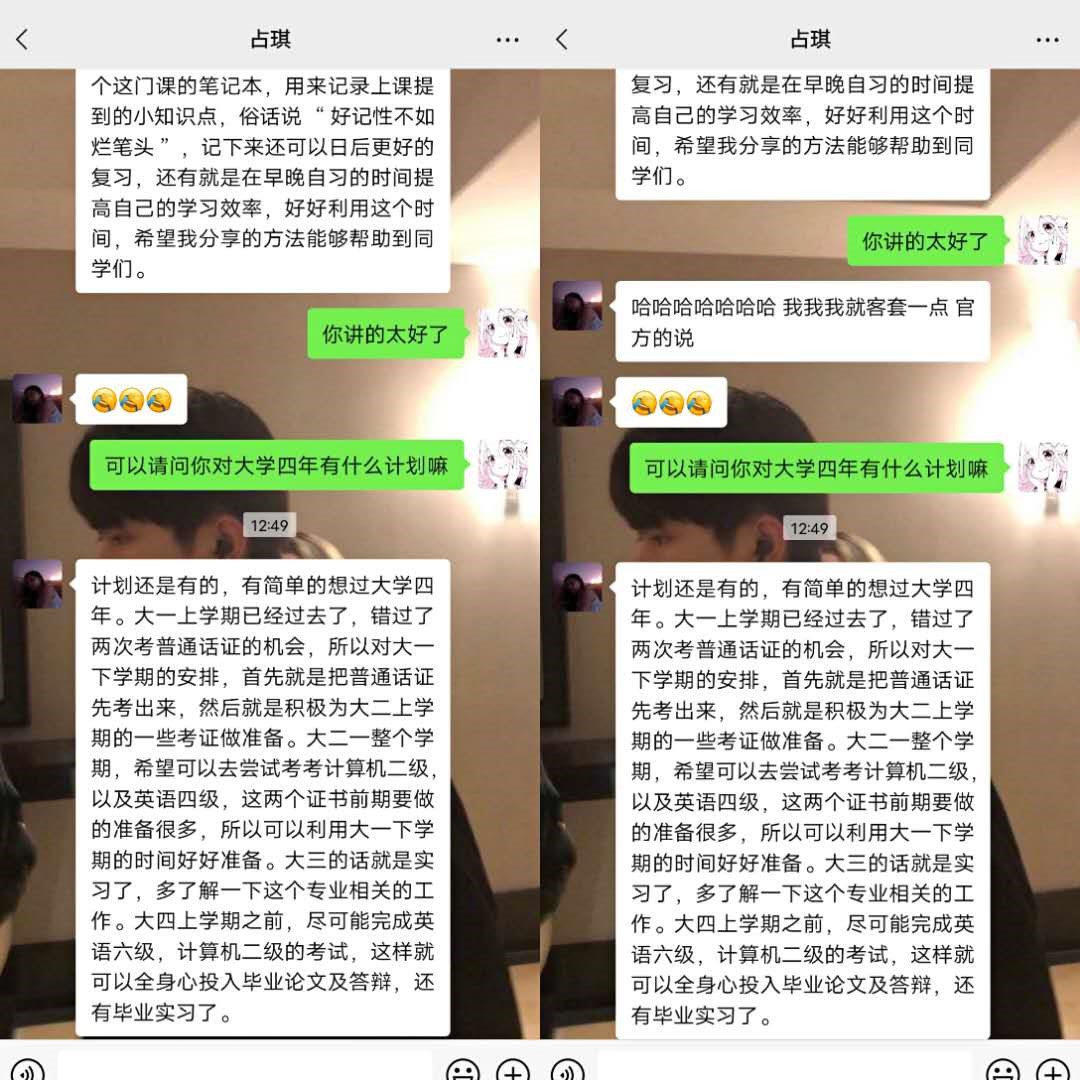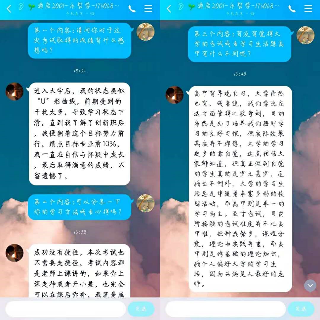 山水一程,笔墨为舟。会展经济与管理专业2001班的张传鑫表示取得第一的好成绩,不仅依赖于自身的坚持与努力,还应该感谢老师们的言传身教。高中与大学学习的不同之处在于大学的生活不仅拓展了我们的思维方式,还丰富了我们的精神世界,这是高中生活所不能给予的。他认为,我们要坚持习近平总书记提出的终身学习观念,从小层面上来说,是为了自身的美好幸福;在大局上,是为了中国社会的美好幸福。在采访中,张传鑫为我们介绍了他在大学四年的学习之旅中的基本规划,在大一时光中要打好坚实的专业基础,提高交际、合作能力,在大二时考取证书证明自己的知识技能;在大三大四的时间里,他志愿考取研究生,去探索更多有关知识的精彩。