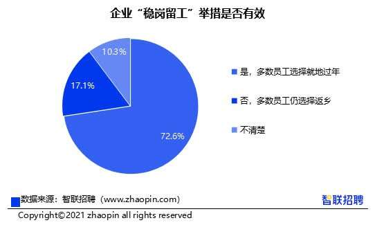 在已制定相关政策的企业中,72.6%的企业自认这一政策奏效,具体反映在多数员工已经选择就地过年,对抗疫行动做出积极贡献。